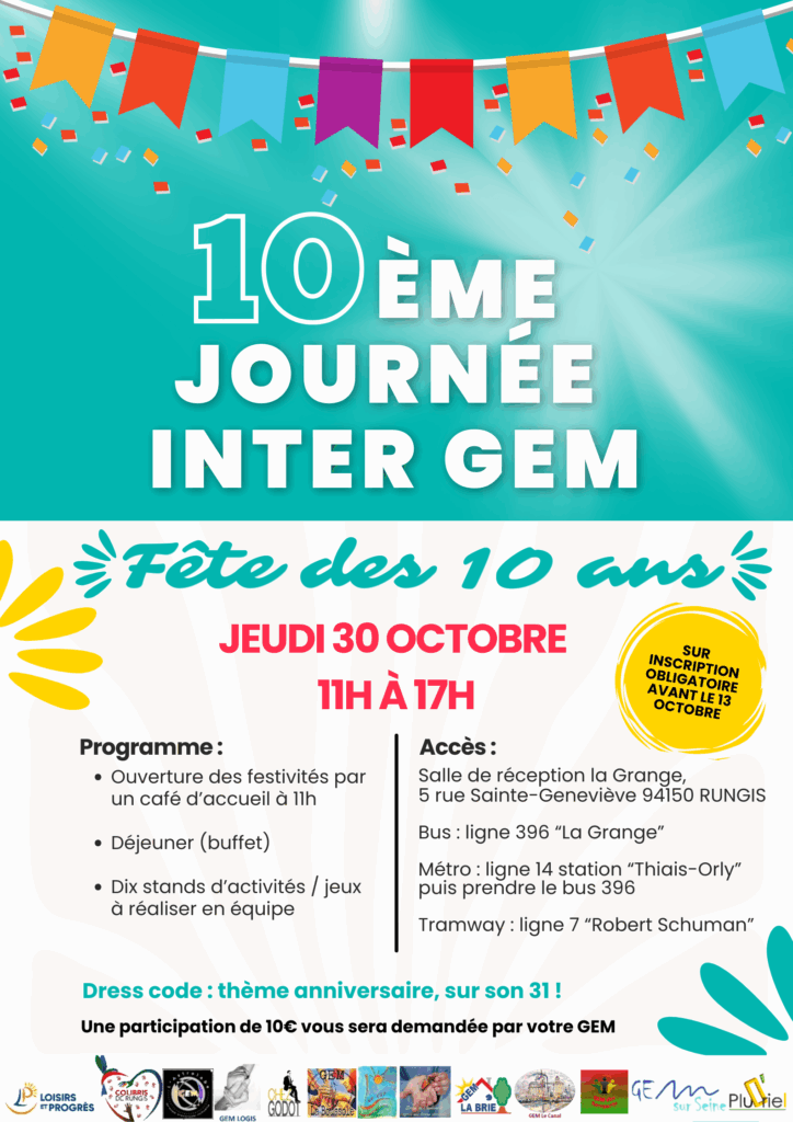 la 10ème Journée Inter GEM aura lieu le jeudi 30 octobre, de 11h à 17h à Rungis au 5 rue Sainte-Geneviève dans la salle de réception « La Grange » (même salle que l’année précédente).